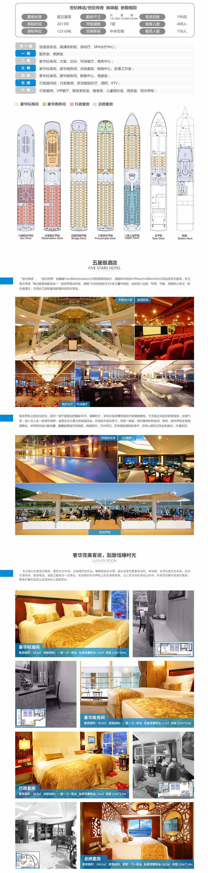 于2013年震撼問(wèn)世,集七大頂尖高新技術(shù)和五大長(zhǎng)江奢華首創(chuàng)為一體的超六星級(jí)豪華游輪!首次采用“電力推進(jìn)和舵槳合一”的國(guó)際頂尖技術(shù),全船每一處都精選零油漆環(huán)保材料,是長(zhǎng)江最環(huán)保的高科技靜音游輪,舒適度和安全性遠(yuǎn)非其他游輪可比擬!