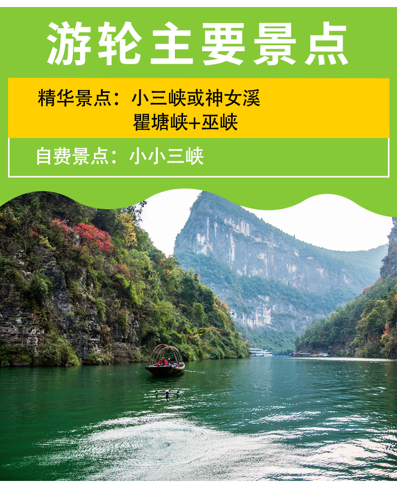 早上8:00游覽國家AAAAA級旅游景區(qū)【AAAAA小三峽】(是寧河下游龍門峽、巴霧峽、滴翠峽的總稱。它南起龍門峽口,北至涂家壩,全長50千米。游覽大寧河小三峽,巴霧峽?、龍門峽、滴翠峽,可飽覽山雄、峰秀、灘險(xiǎn)、水清、石奇、景幽的峽谷風(fēng)光和奇山秀水特色是三峽地區(qū)的一條大支流。游程往返5小時(shí)左右)返船續(xù)航?;?span style="color:#f30">【AAAA神女溪】,神女溪位于長江三峽巫峽的腹心。全長30公里, 乃峽中之奇峽,是人跡罕見的原始處女谷,傳說七仙女曾在此沐浴。峽內(nèi)壑谷曲折,峭壁千丈,碧峰萬仞,群巖蔽日,天開一線,穿行其間,時(shí)而大山阻隔,時(shí)而峰回路轉(zhuǎn)。峽谷中霧氣迷朦,兩岸植被郁郁蔥蔥,原始古樸,洞幽景佳,船棺千古,恰似世外桃源,令人如癡如醉。游覽結(jié)束后返回游船,游船觀瞿塘峽雄姿。