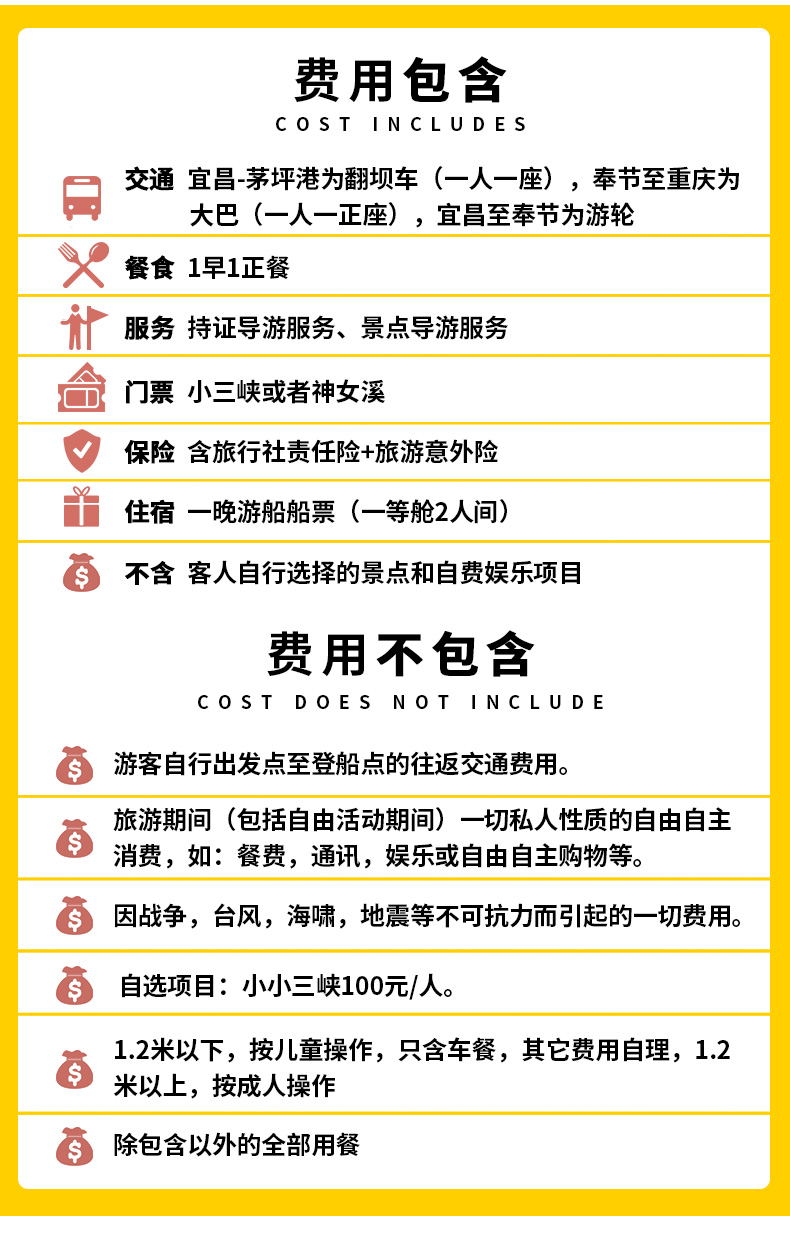 2、交通 :宜昌-茅坪港為翻壩車(保證一人一座),奉節(jié)至重慶為空調(diào)旅游車(保證一人一正座),宜昌至奉節(jié)為游輪,長江三峽提倡綠色環(huán)保,船上都不提供一次性洗漱用品,游客需自備,請諒解!